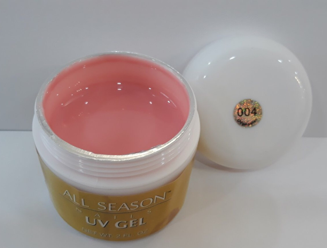 Гель для нарощування нігтів All Season можна використовувати як однофазний гель, так і в якості 2-ї фази у 3-фазної гелевою системі. Має гарне зчеплення з нігтьової пластиною, створює міцні і зносостійкі нігті. Гель середньої щільності, самовирівнюється. Має липкий шар.
